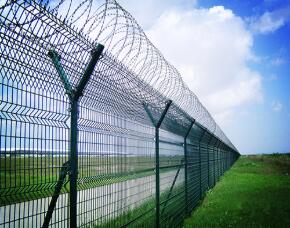 機(jī)場圍界加工工藝上來分:機(jī)場編織防護(hù)隔離圍界,機(jī)場焊接防護(hù)隔離圍界、機(jī)場鋼板網(wǎng)圍界。機(jī)場飛行區(qū)圍界采用物理圍界阻隔(如單/雙層金屬圍欄或磚墻并附加圈刺滾籠等),在這里我們詳細(xì)說明一下飛行區(qū)圍界阻隔網(wǎng),機(jī)場物理圍界圍墻要求物理圍界內(nèi)側(cè)、外側(cè)的凈高度應(yīng)不低于2.5m,離地間隙不大于3cm。其中頂部防攀爬設(shè)施采用刺絲滾籠或刀片刺網(wǎng)等結(jié)構(gòu)的圍欄(墻)。