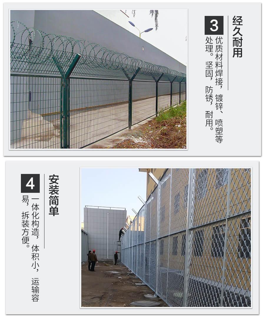 監獄圍欄網可以使罪犯從外表上有很強的直接震撼效果,從心理上消除了逃生的念頭。卡口網設計具有*剪,*爬的功能,可以有效防止罪犯潛逃。