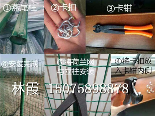其次公路護欄網網片的常用規格--1、網孔:5.5*5.5/6.5*6.5/6*6/5.5*11/2.5*2.5厘米2、絲徑(塑后):2.0-3.0毫米3、網寬:1-2米4、網長:30米另外必不可少的公路護欄網專用立柱--燕尾柱1、厚度:0.5-1.2毫米2、長度:1.5-2.3米護欄網安裝專用卡鉗--燕尾柱配套的每根頂端都有防雨帽,立柱上也配帶有卡扣,這些都是立柱上本身就有的,報價也是成套的價格,但是安裝時候需要用到的卡鉗則需要親們另外購買的~~~~
