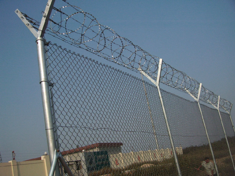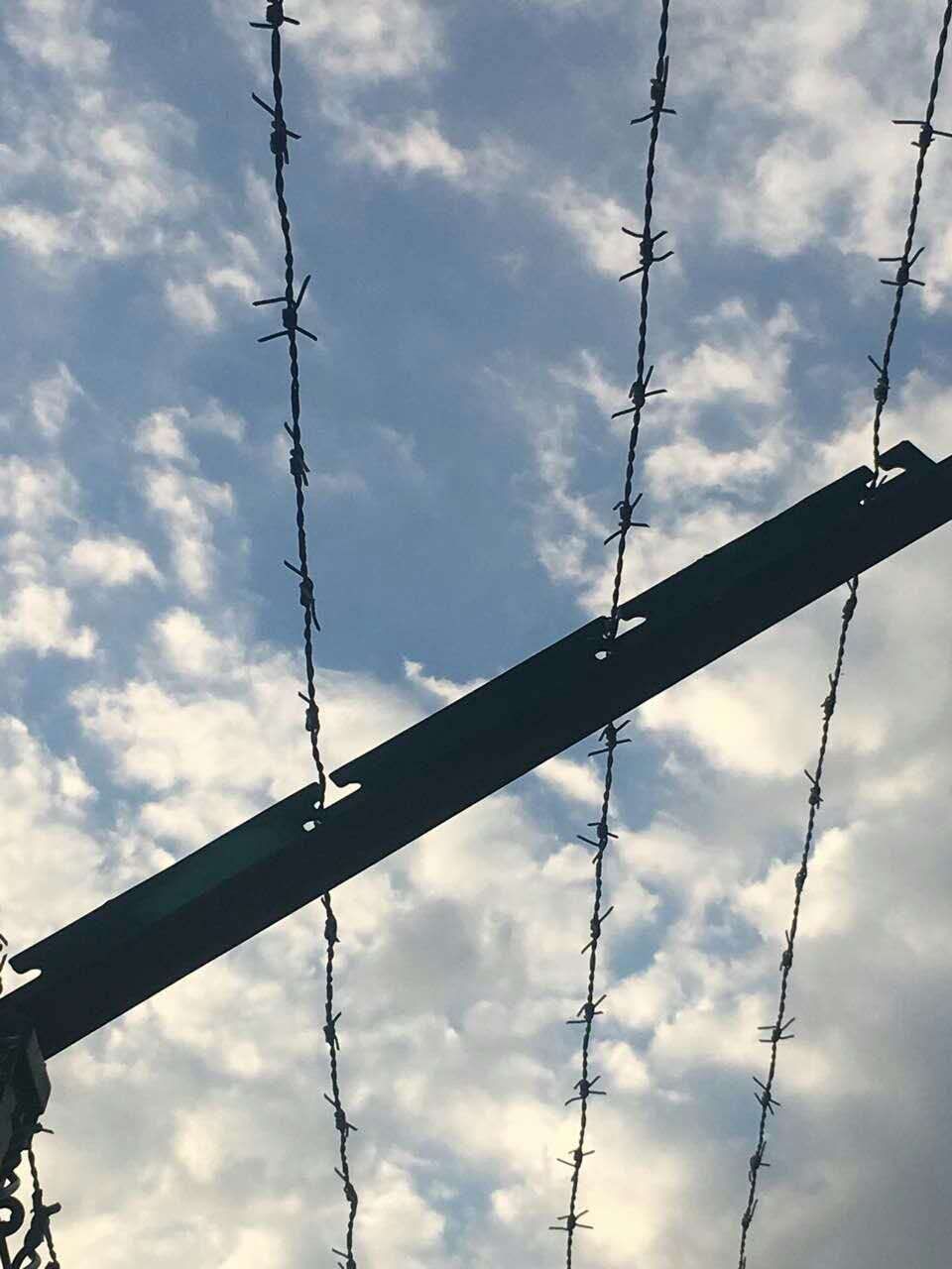 刺絲固定于Y型曲臂上,曲臂兩側刺絲數量均為4根,共計8根。刺絲材質為鋅鋁合金,采用中1.7的雙股線,倒韓1.6,每個倒刺伸出四個點,刺長為16mm,間距為100mm,倒刺采用熱鍍鋅,平均鍍鋅量為135g/㎡。刺絲編織特點:外形美觀,線條簡捷,銀色外表,現代潮流,防盜設計,刺絲環繞間用刺繩卡扣連接,防盜,安全,開啟方便,規格多,滿足不同環境。