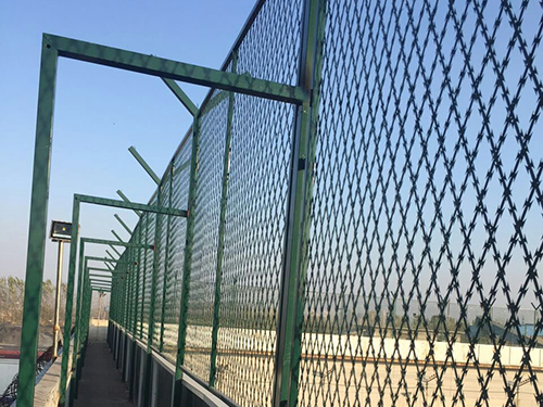 監(jiān)獄、看守所巡邏道隔離網(wǎng)上部安裝刀片刺網(wǎng)(刺絲滾籠),刀片刺網(wǎng)具有嚇阻、防翻越等效果,材質(zhì)堅硬,高強度,高張力,造型設(shè)計獨特,不宜觸摸,因而能達(dá)到極好的防護(hù)隔離效果。巡邏道隔離網(wǎng)還具有施工簡便,經(jīng)濟(jì)實用等優(yōu)點。