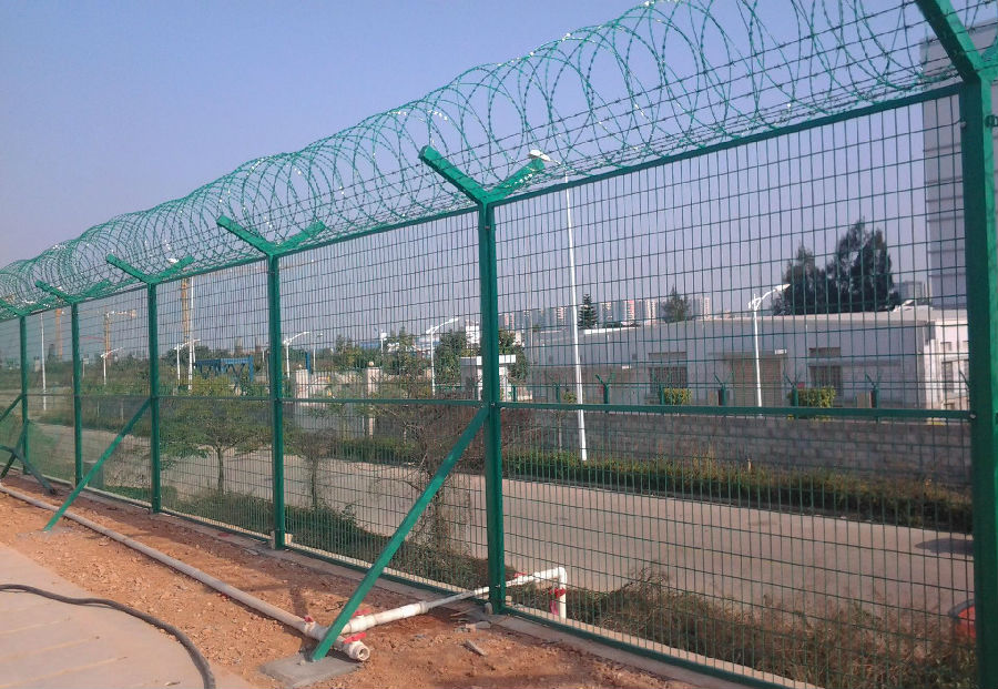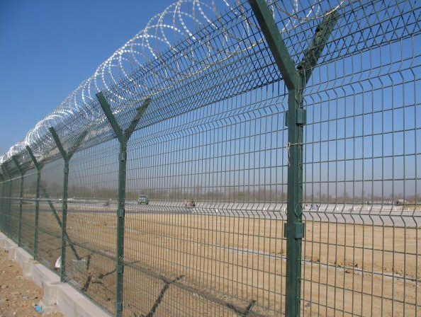 機場護欄網經過編焊而成;網格結構簡練、便于運輸、安裝不受地形起伏限制,特別是對于山地、坡地、多彎地帶適應性極強。機場護欄網的主要特點是網身高大,防攀爬能力強,*沖擊,表面雙層*防腐處理,可達到10年的超長壽命,一經推出,就得到了各大機場的高度認可,機場護欄網是由V型支架立拄,加強型焊接片網,安全防盜連接件和熱鍍鋅刀片刺籠組成是強度和安全防御性級別很高的防護安全。注:如果在機場護欄網頂部加裝刀片刺絲、刀片刺繩后又很好的增強了安全防護性能。